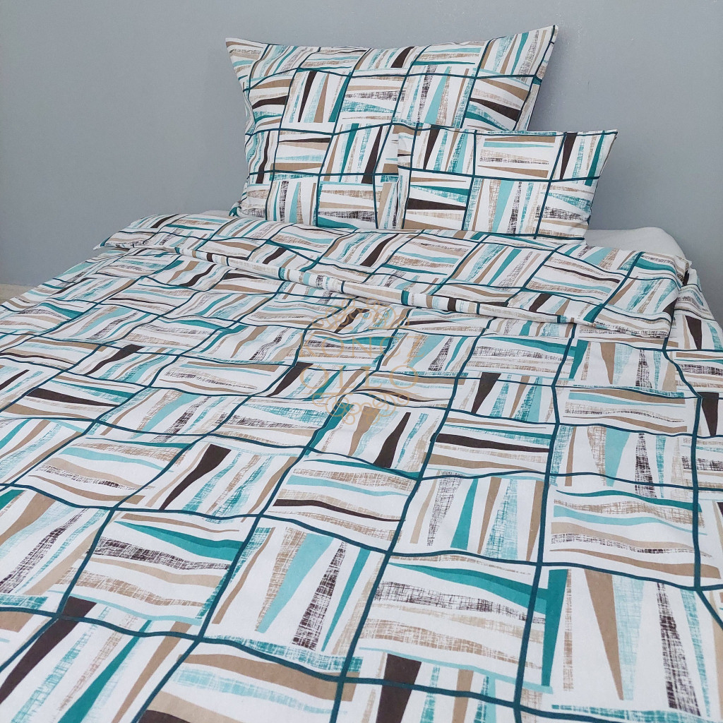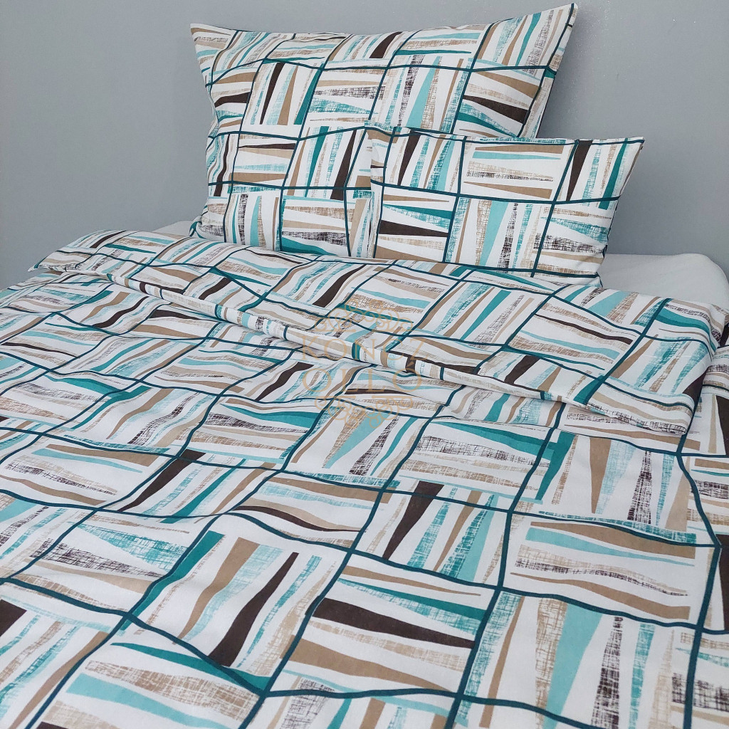 Modern, letisztult megjelenésű ágyneműhuzat szett türkiz, bézs és barna árnyalatok harmonikus kombinációjával.
