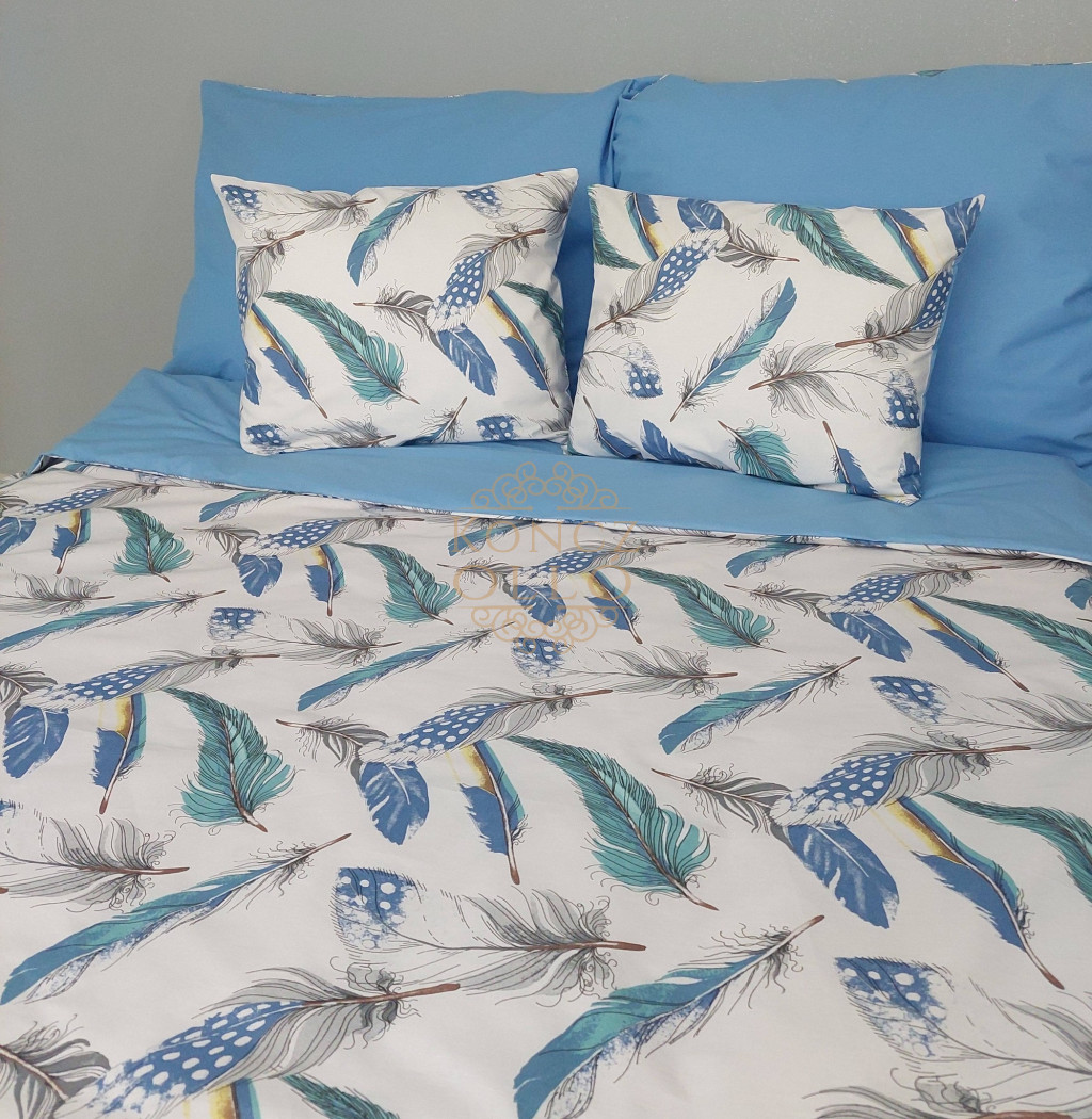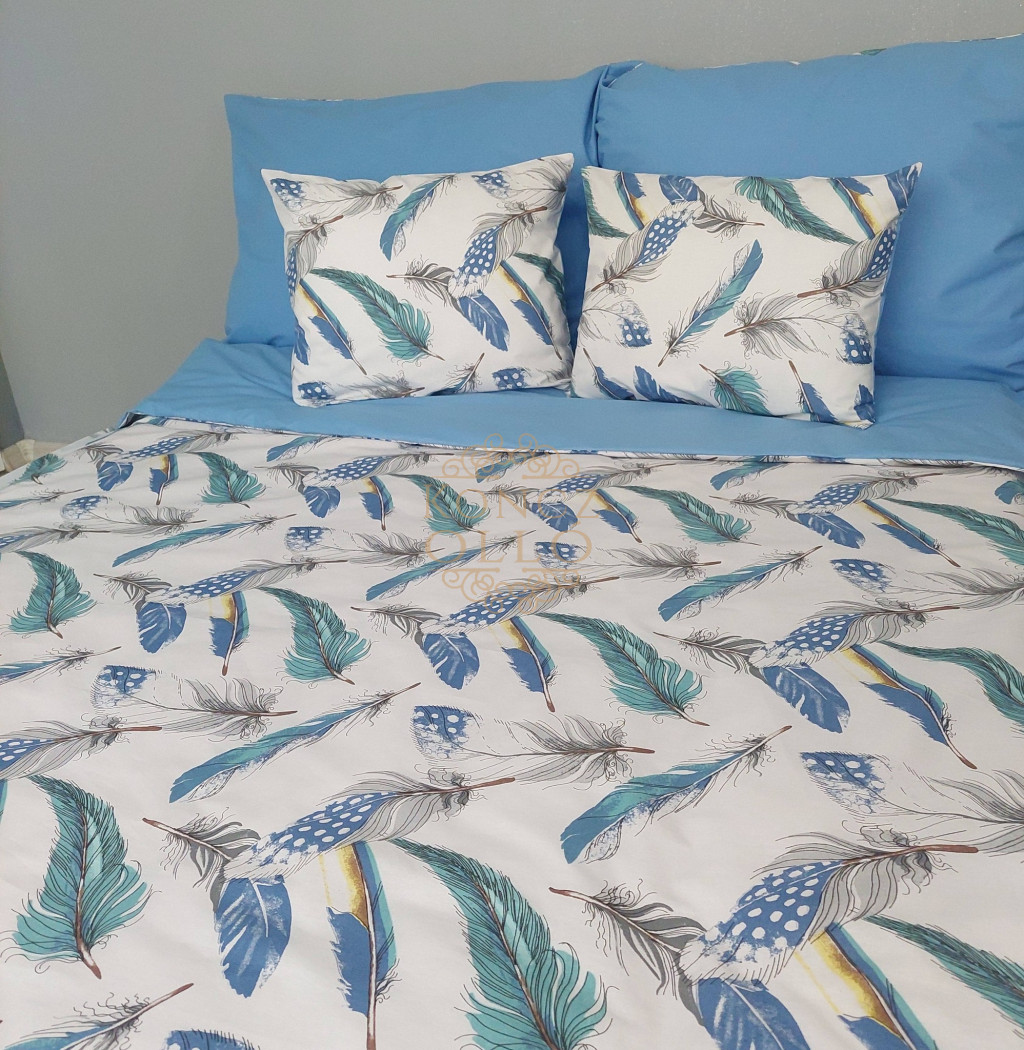 Friss és légies megjelenésű ágyneműhuzat kék és türkiz tollmintával.